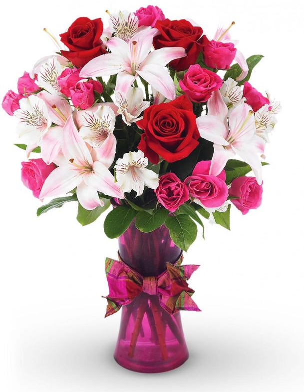 1 розовая лилия, 1 красная роза, 1 альстромерия, 1 розовая кустовая роза, зелень, лента2 розовых лилии, 3 красных роз, 2 альстромерий, 2 розовых кустовых розы, зелень, лента3 розовых лилий, 5 красных роз, 5 альстромерий, 4 розовых кустовых розы, зелень, лента